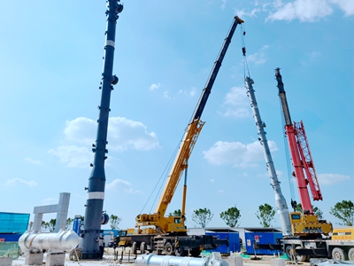 據(jù)悉,此次吊裝吸收塔和再生塔是本項(xiàng)目脫酸單元的核心設(shè)備,為確保本次吊裝的平穩(wěn)有序推進(jìn),項(xiàng)目組積極與咸陽禮泉縣道路運(yùn)輸管理部門、供貨商、施工方等各方對接,確定了發(fā)貨時(shí)間、運(yùn)輸路徑,并嚴(yán)格篩查相關(guān)人員行程軌跡,確保吸收塔和再生塔的順利進(jìn)場。隨后及時(shí)進(jìn)行設(shè)備驗(yàn)收,同時(shí)督促施工方制定并優(yōu)化吊裝方案,確保吊裝機(jī)具到位,將吸收塔和再生塔成功吊裝到位。
