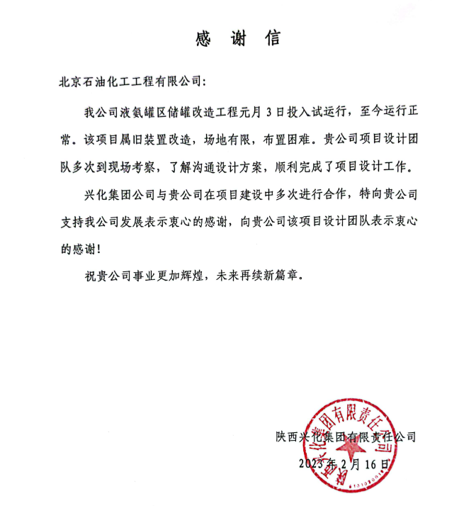 近日,北京石油化工工程有限公司收到陜西興化集團發(fā)來的感謝信,對我公司在負(fù)責(zé)液氨罐區(qū)儲罐改造工程設(shè)計工作期間優(yōu)化設(shè)計方案、主動協(xié)調(diào)配合,高質(zhì)量完成建設(shè)任務(wù)給予了充分肯定。