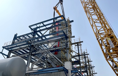 乙酸甲酯加氫反應器總重460噸,最大直徑5.9米,設備于臨近項目的制造廠完成整體制造后,采用模塊車運輸至現(xiàn)場。設備吊裝主吊采用1250噸履帶吊,400噸履帶吊溜尾。設備于10時38分起吊,歷時三小時順利就位于框架基礎上。