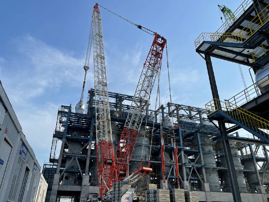 期間,項目還陸續(xù)完成二甲醚塔器、羰基化及產品分離繞管換熱器等大件設備吊裝,精準規(guī)劃吊車轉場,提高吊車使用效率。