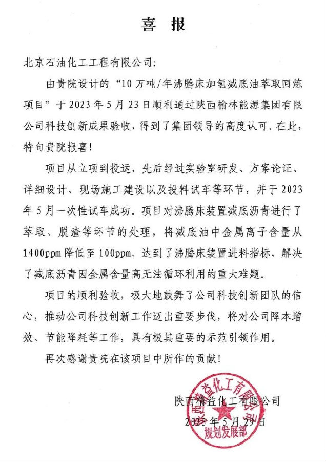 近日,由北京石油化工工程有限公司設(shè)計(jì)的陜西精益化工10萬噸/年減底油萃取回?zé)掜?xiàng)目開車成功并通過業(yè)主驗(yàn)收,得到業(yè)主的高度認(rèn)可。該項(xiàng)目以沸騰床煤焦油加氫裝置的減底油渣為原料,回收其中可重復(fù)利用的組分,并將油渣中的膠質(zhì)/瀝青質(zhì)及金屬離子含量控制在一定范圍內(nèi),從而滿足沸騰床回?zé)挼倪M(jìn)料要求,為焦油加氫企業(yè)處理未轉(zhuǎn)化的油渣提供了一條全新途徑,大幅提升了企業(yè)經(jīng)濟(jì)效益。(通訊員/韓金奇)
