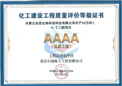 近日,中國(guó)化工施工企業(yè)協(xié)會(huì)公布2023年化工建設(shè)工程質(zhì)量評(píng)價(jià)結(jié)果,北京石油化工工程有限公司總承包的“內(nèi)蒙古東景生物環(huán)??萍加邢薰灸戤a(chǎn)20萬(wàn)噸1,4丁二醇(BDO)項(xiàng)目”榮獲化工建設(shè)工程質(zhì)量評(píng)價(jià)4A級(jí)(優(yōu)質(zhì)工程)。