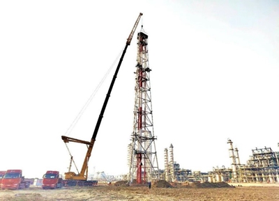 據(jù)悉,該火炬高80米,總重100噸,分三段在地面組裝后依次進(jìn)行吊裝。為確保吊裝工作的順利進(jìn)行,項(xiàng)目部組織業(yè)主、監(jiān)理、承包商對(duì)火炬組裝的質(zhì)量及組裝臨時(shí)平臺(tái)的搭設(shè)情況進(jìn)行全方位檢查,吊裝過(guò)程中,項(xiàng)目人員嚴(yán)格按照操作規(guī)程執(zhí)行,確保吊裝作業(yè)的安全、平穩(wěn)。目前,施工人員正加緊配套地面火炬管廊、附屬設(shè)備等相關(guān)工作,加班加點(diǎn)確?;鹁姘雌谕队?。