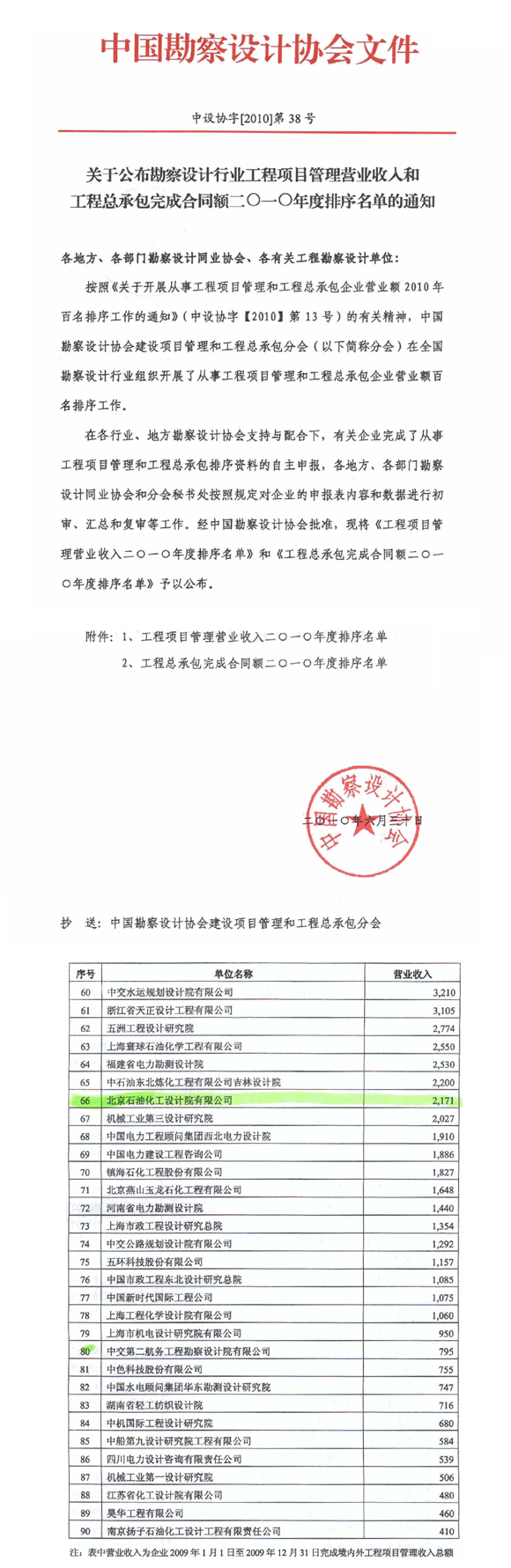 在中國(guó)勘察設(shè)計(jì)協(xié)會(huì)(中設(shè)協(xié)字[2010]第38號(hào))近日公布的“勘察設(shè)計(jì)行業(yè)工程項(xiàng)目管理營(yíng)業(yè)額收入二〇一〇年度排序名單”中,我院喜獲排名第66位,這是繼二〇〇八、二〇〇九年之后,我院連續(xù)第三次躋身全國(guó)百名排序名單之中。