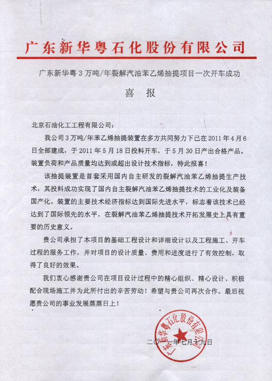 由我公司負(fù)責(zé)設(shè)計(jì)的廣東新華粵3萬(wàn)噸/年裂解汽油苯乙烯抽提項(xiàng)目于2011年5月18日投料開(kāi)車,并于5月30日產(chǎn)出合格產(chǎn)品。目前,裝置負(fù)荷和產(chǎn)品質(zhì)量均達(dá)到或超過(guò)設(shè)計(jì)技術(shù)指標(biāo)。為此,業(yè)主單位廣東新華粵石化股份有限公司特向我公司發(fā)來(lái)喜報(bào)。