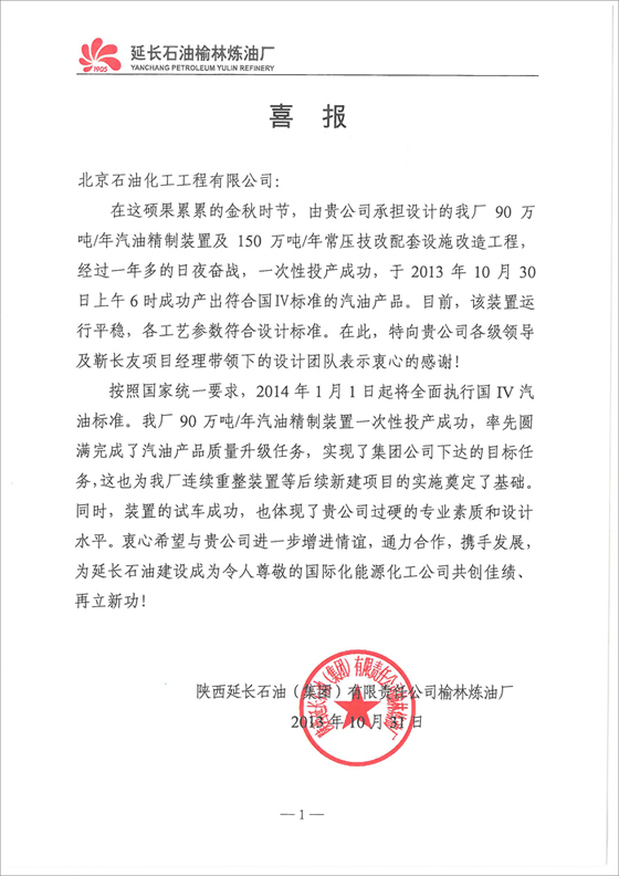 由我公司承擔設計的榆林煉油廠90萬噸/年汽油精制裝置,經過一年多設計和施工單位的日夜奮戰(zhàn),已于2013年10月30日成功生產出符合國IV標準的汽油,目前該裝置運行平穩(wěn),各工藝參數達到設計指標。為此,業(yè)主單位延長石油榆林煉油廠特向我公司發(fā)來喜報。
