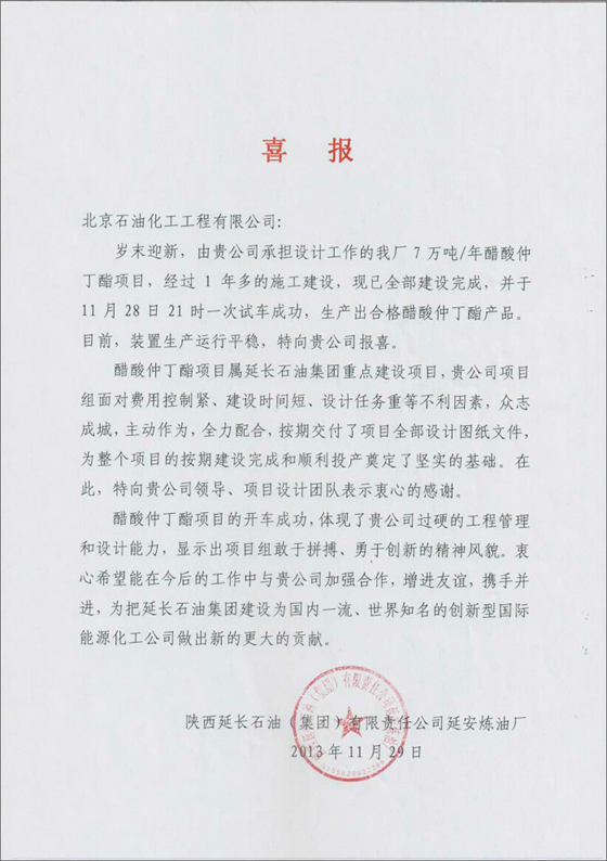 由我公司設(shè)計(jì)的陜西延長(zhǎng)石油(集團(tuán))有限責(zé)任公司延安煉油廠7萬(wàn)噸/年醋酸仲丁酯項(xiàng)目,經(jīng)過(guò)近1年的設(shè)計(jì)、采購(gòu)和施工建設(shè),整個(gè)工程已全部建設(shè)完成,2013年11月28日一次試車成功,生產(chǎn)出合格的醋酸仲丁酯產(chǎn)品,目前各裝置生產(chǎn)運(yùn)行平穩(wěn)。為此,業(yè)主單位特向我公司發(fā)來(lái)喜報(bào)。